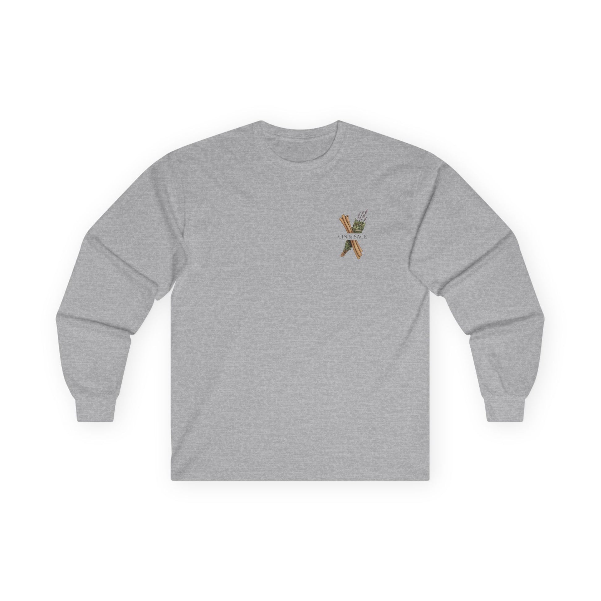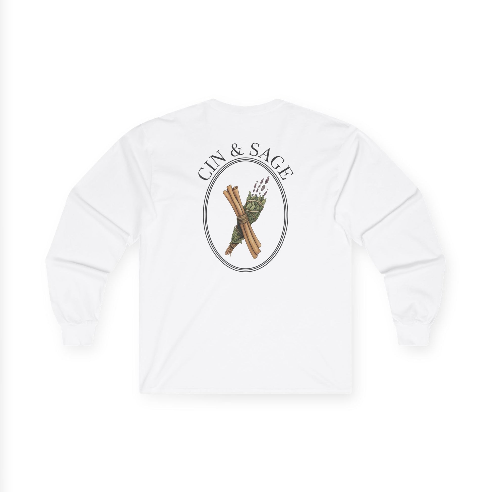 Soft, breathable long-sleeve with a calm, earthy vibe—printed with small, intentional artwork at the chest and a larger illustrated emblem on the back that pairs cinnamon sticks with fresh sage. Lightweight but substantial, the tee settles into the shoulders and chest like a familiar ritual. Wear it on cool mornings while you brew coffee, during slow afternoons arranging herbs, or layered under a jacket for an evening walk. The graphic reads like a quietly curated label from a home apothecary—subtle, thoughtful, and rooted in craft. It complements minimalist wardrobes and those who favor botanical, slow-living aesthetics.